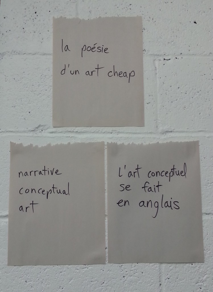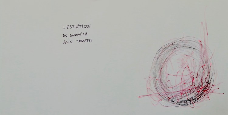 Publication Facebook, 2020.Marqueur permanent sur papier journalPoème sur Twitter, 2018Purée de poire, crayons de couleurs sur papier noirGros luxe, photographie, 2020.PhotographieAffiche-poème, 2015. Site du projetAffiche-poème, 2015. Site du projetAffiche-poème, 2015. Site du projetDessin à l’encre (non-résistante à la lumière) sur papierL’esthétique du sandwich aux tomates, dessin à l’encre sur papierInstallation
