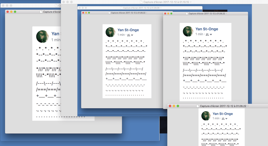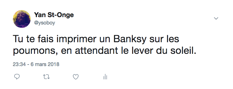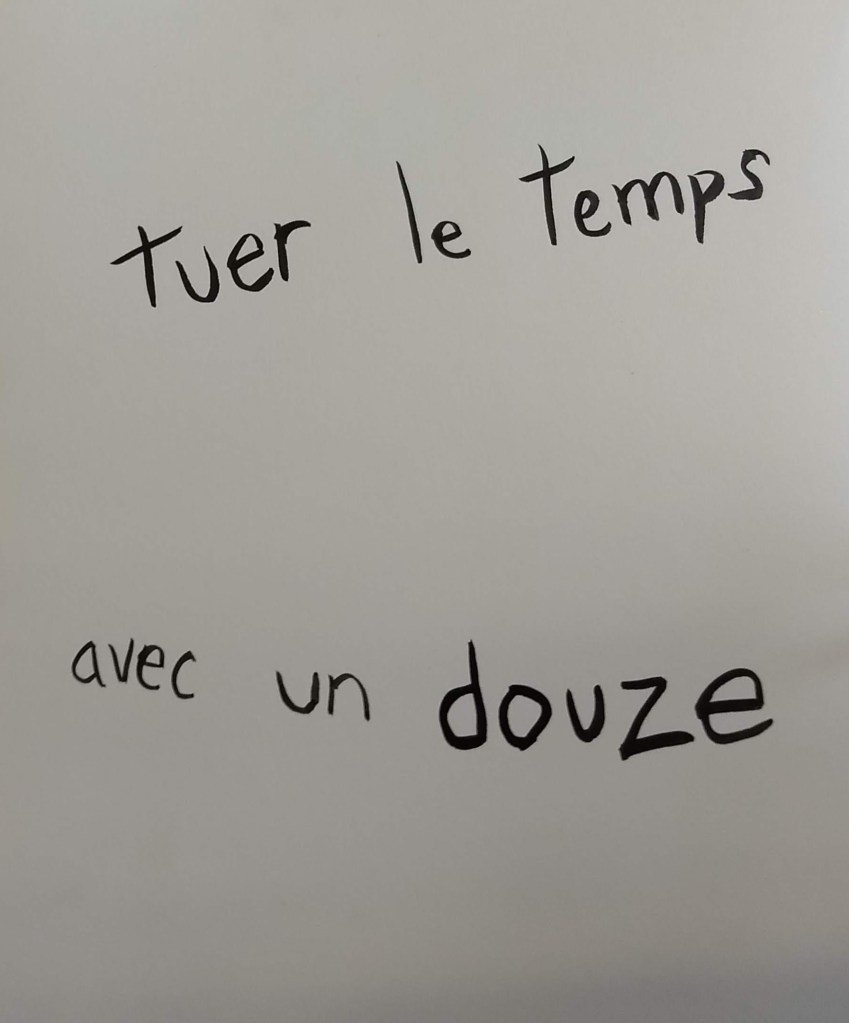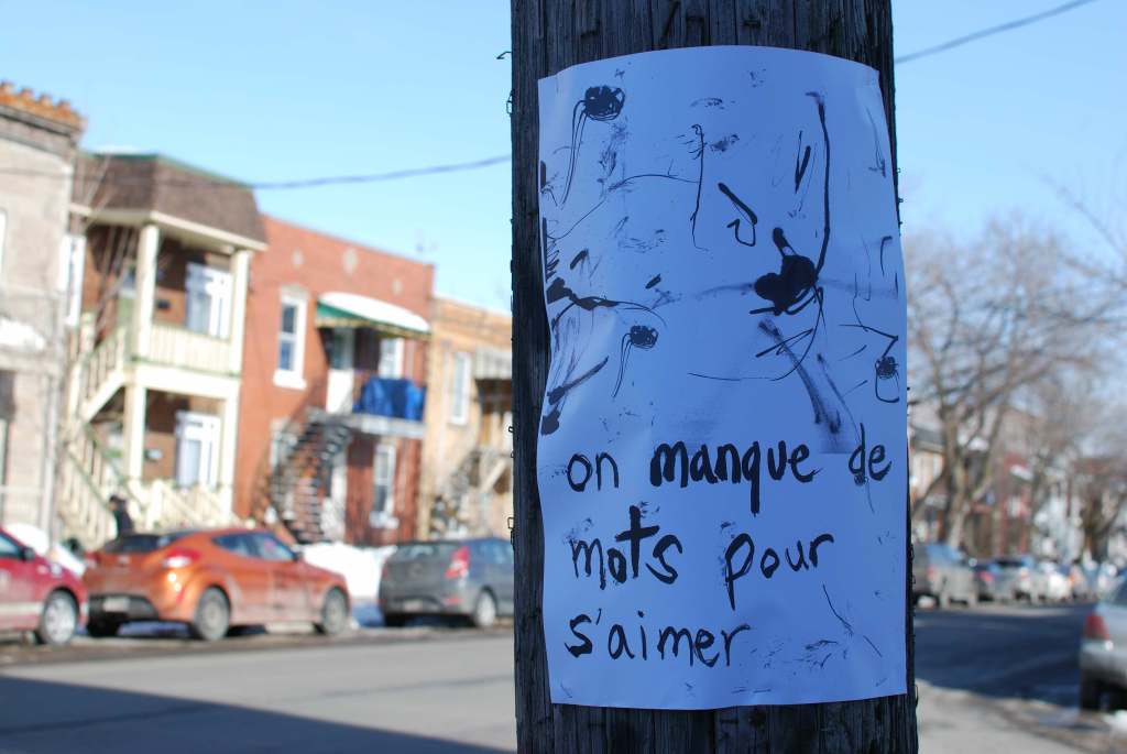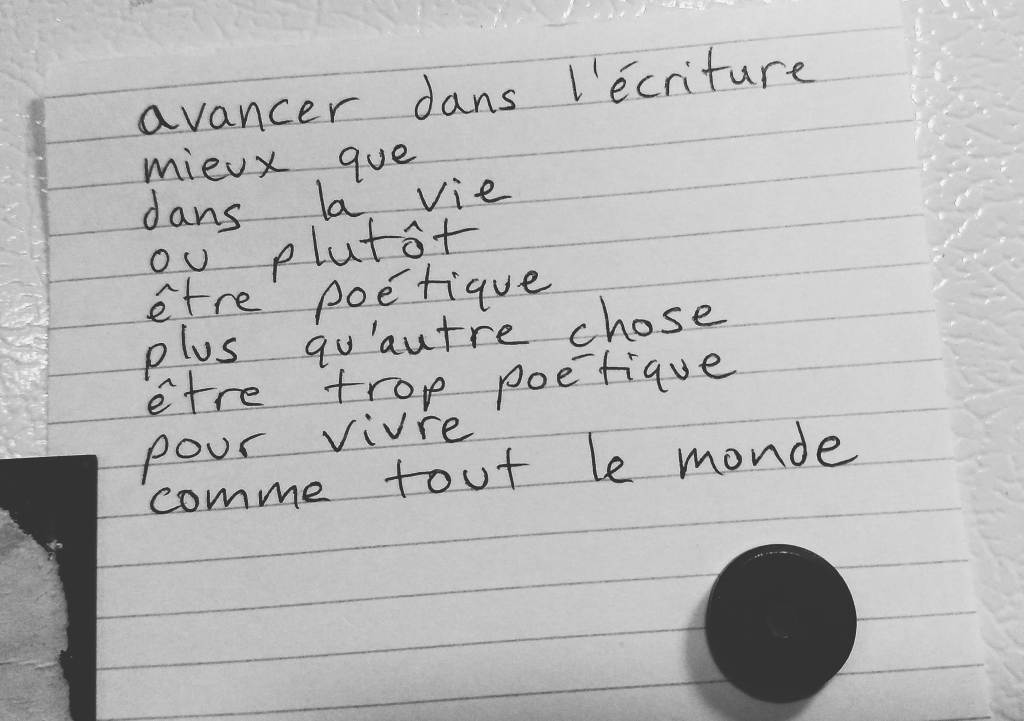 Happy (confinement), photo, 2020.Un drop out du présent, encre de chine sur papier.Land art, Val-Morin, 2016photographieTuer le temps, encre de chine sur papier. Collection privée.PhotographieMademoiselle au chalet, Photographie, 2012.Erreur 404: extrait de ma collection, capture d’écran.Sculpture, plasticine, 2016Sculpture, plasticine, 2016Sculpture, plasticine, 2016Sculpture, plasticine, 2016Sculpture, plasticine, 2016Sculpture, plasticine, 2016Sculpture, plasticine, 2016Affiche-poème (avec Jeanne 8 ans), 2015. Site du projetEncre de stylo sur photocopie